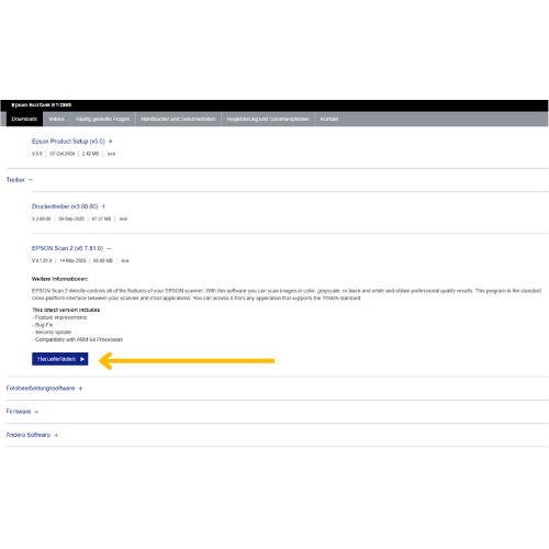 Scrollen Sie nach unten, klicken Sie auf „+“ unter Treiber, wählen Sie Epson Scan 2, klicken Sie erneut auf „+“ und dann auf Herunterladen.