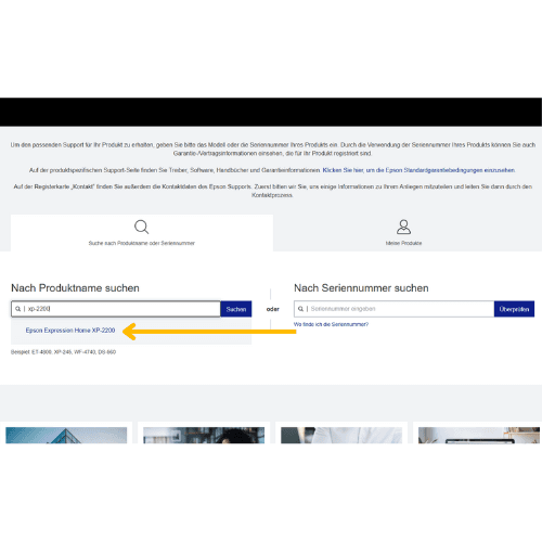 Geben Sie Ihr Druckermodell ein (z. B. Epson XP-2200) und klicken Sie auf Suchen.