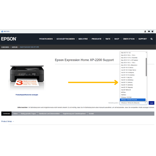 Wählen Sie Ihr Betriebssystem. Epson bietet 5 OS: Windows, macOS, Linux, Android, iOS (die Website erkennt es normalerweise automatisch).